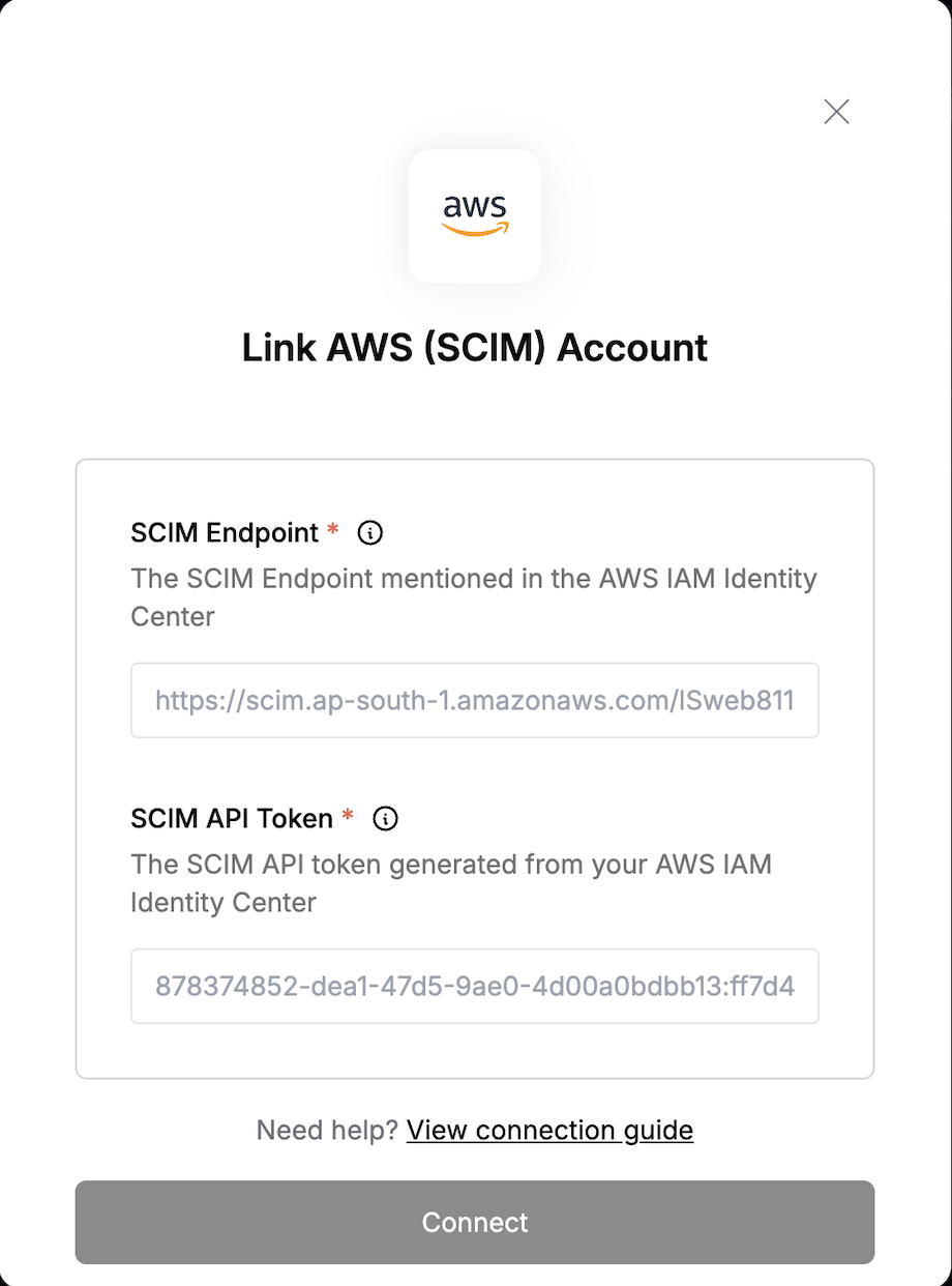 To authenticate with AWS SCIM, you need two key pieces of information:- SCIM API Token - A token generated from your AWS IAM Identity Center to authenticate SCIM requests.