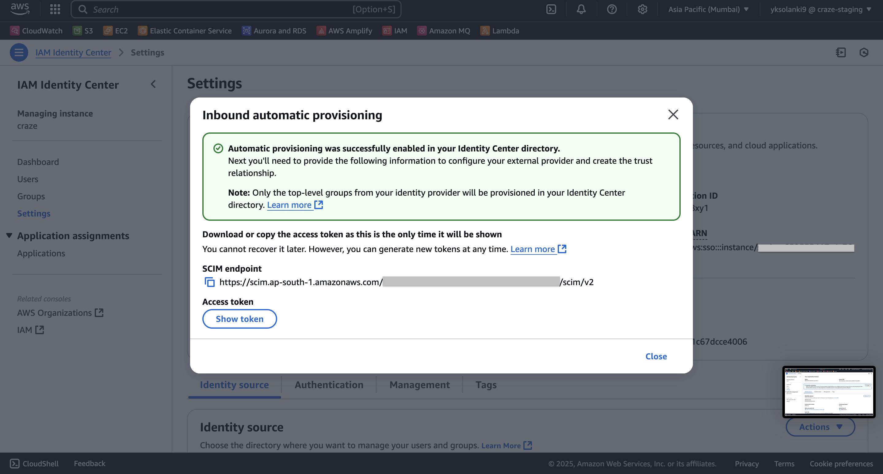 - The SCIM configuration will be shown, copy the SCIM Endpoint and Access Token to connect to AWS.