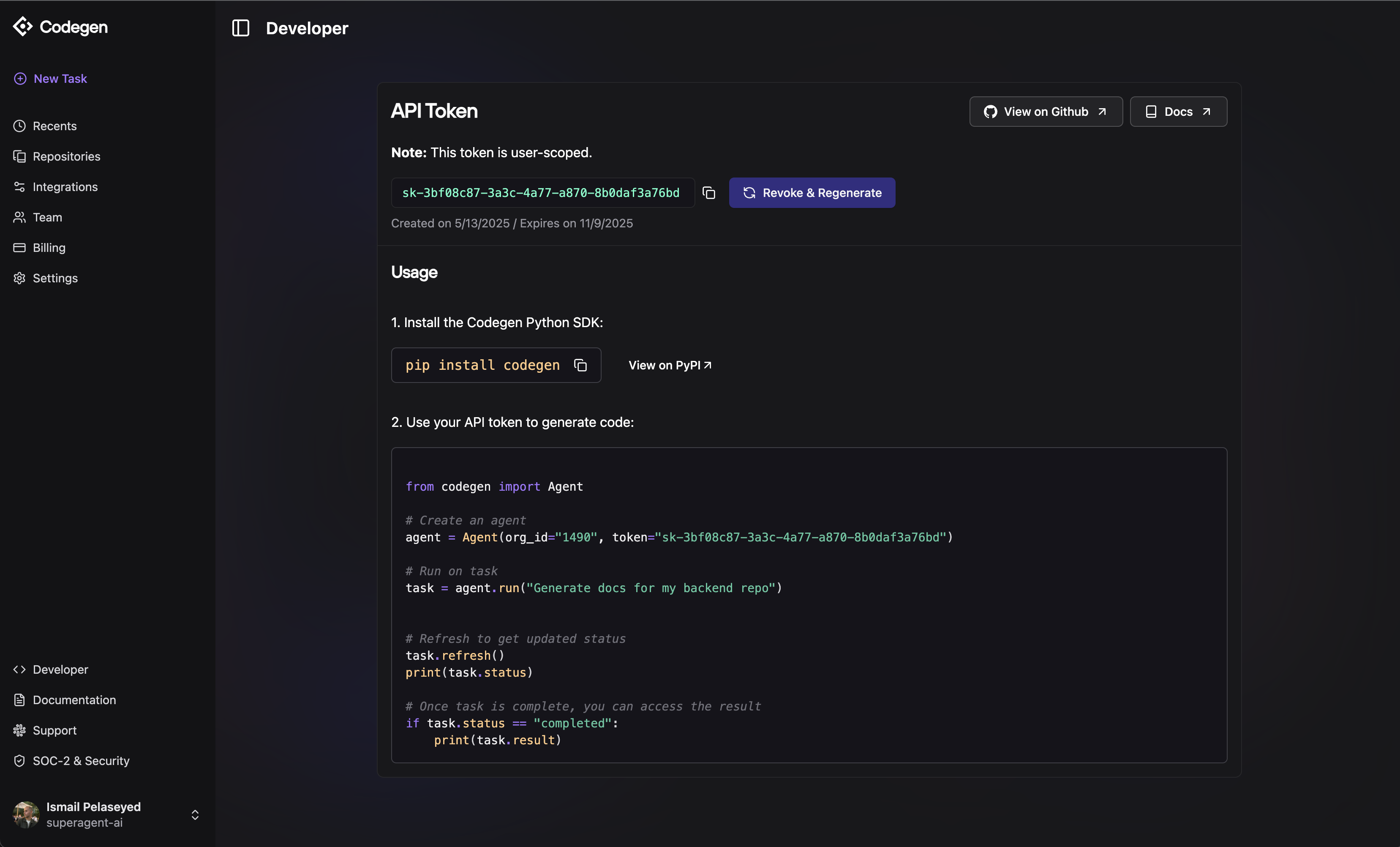 To authenticate with Codegen, you need:- Token - A token that grants Nango permission to interact with Codegen’s APIs resources and services.