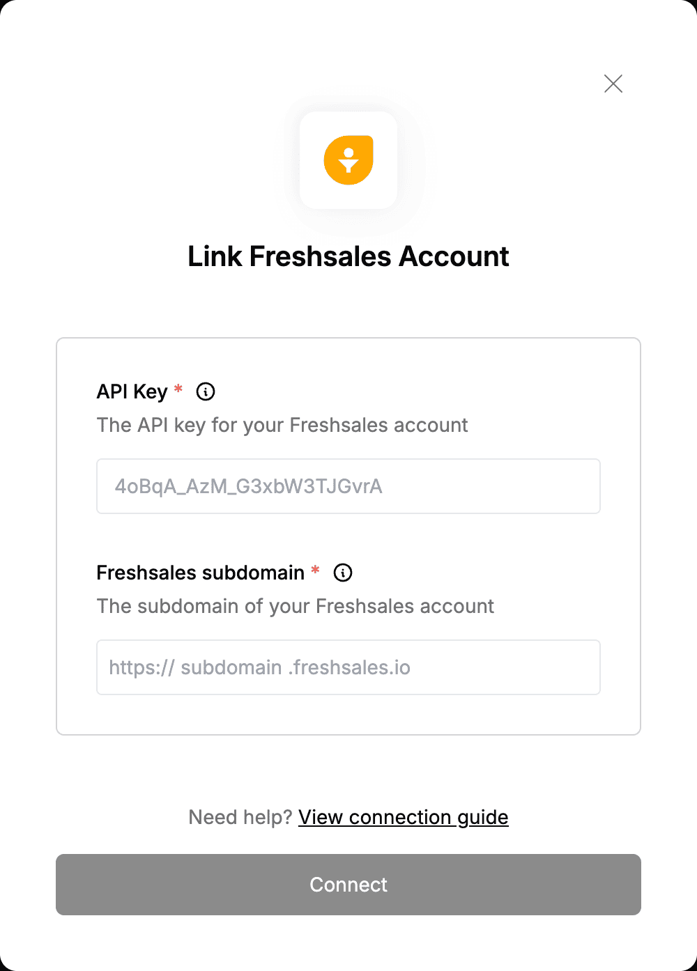 - Enter the API Key and Freshsales subdomain in their designated fields.