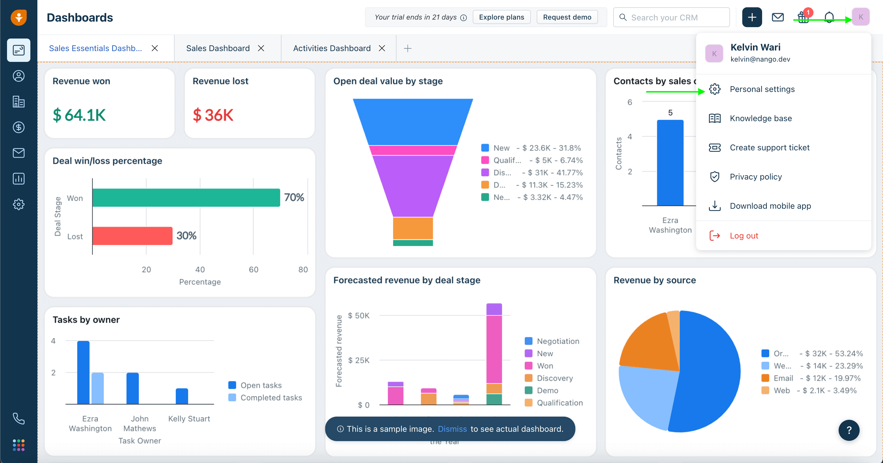 - Login to your Freshsales account. Click on your Profile picture and select Personal Settings.