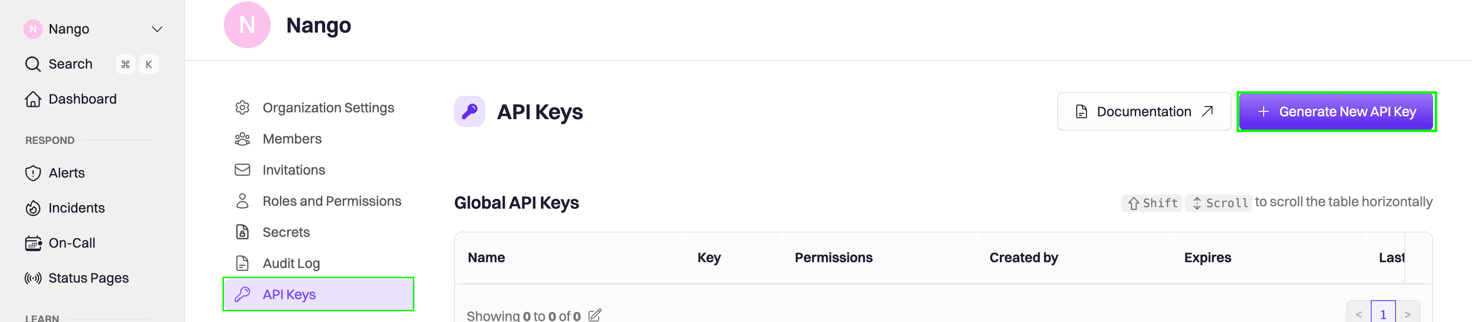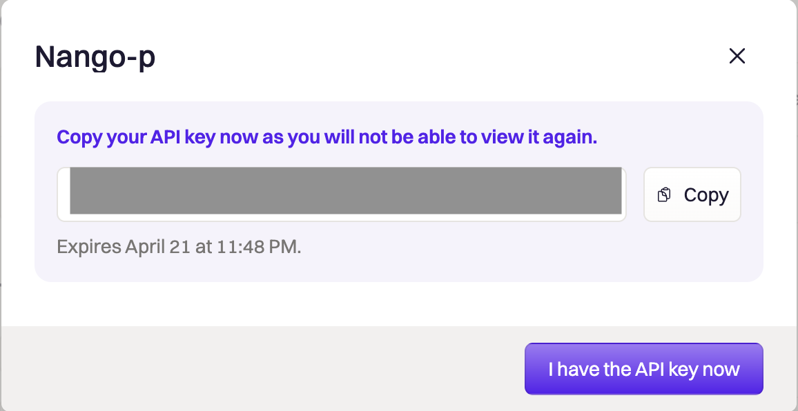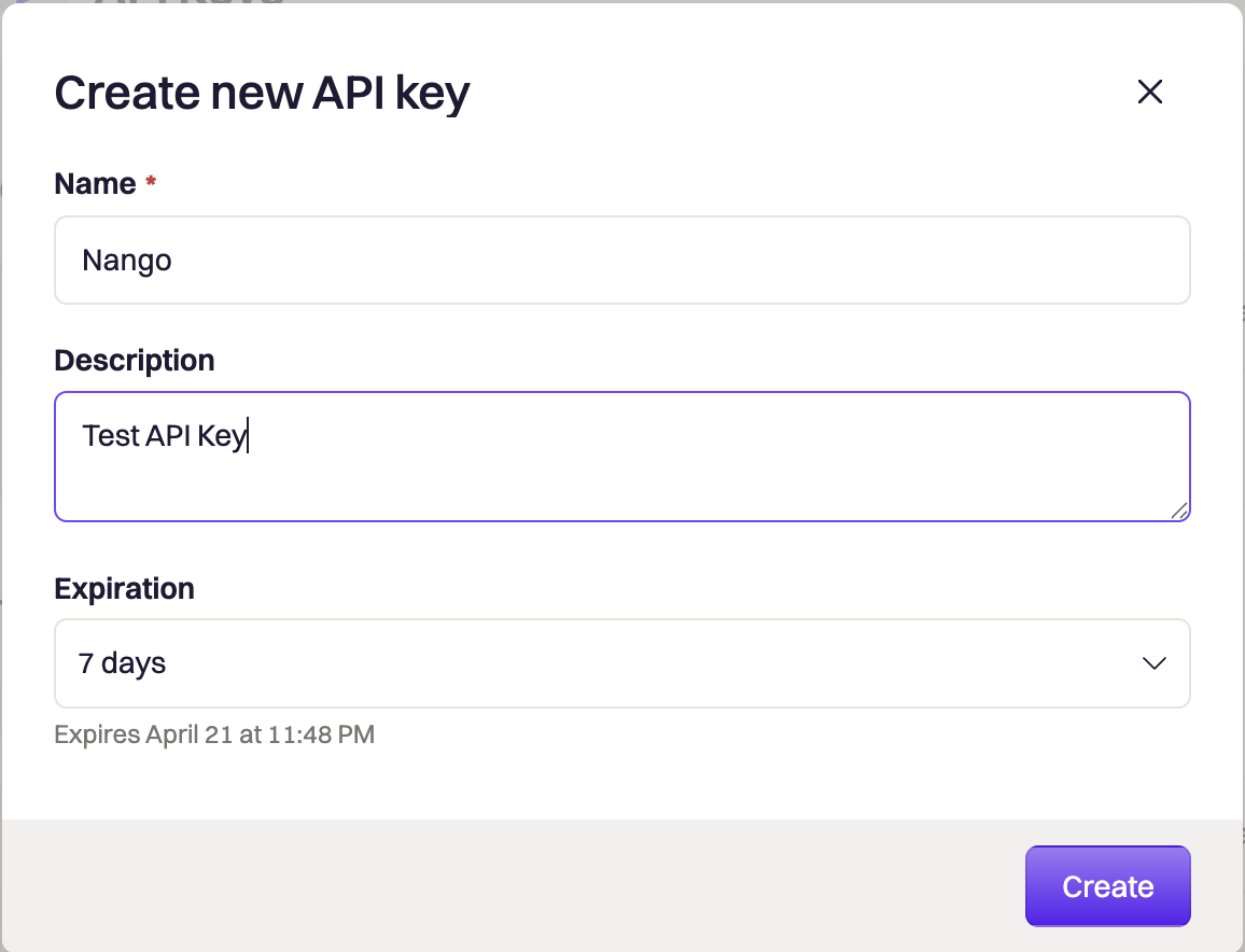 - Name - A label to help you identify the purpose of this API key (e.g., Nango Integration).