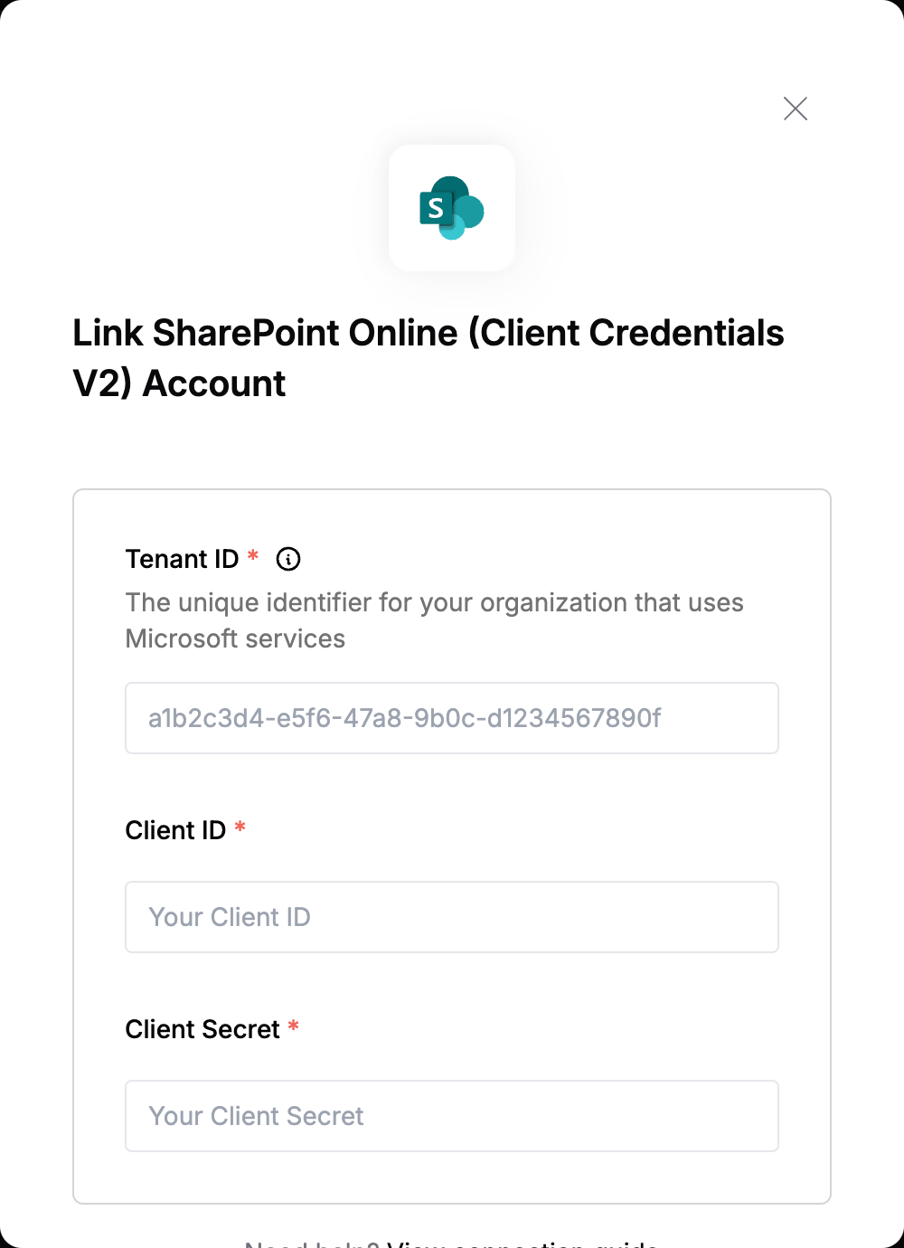 To authenticate with SharePoint Online (Client Credentials V2), you need:- Tenant ID - The unique identifier for your organization that uses Microsoft services.