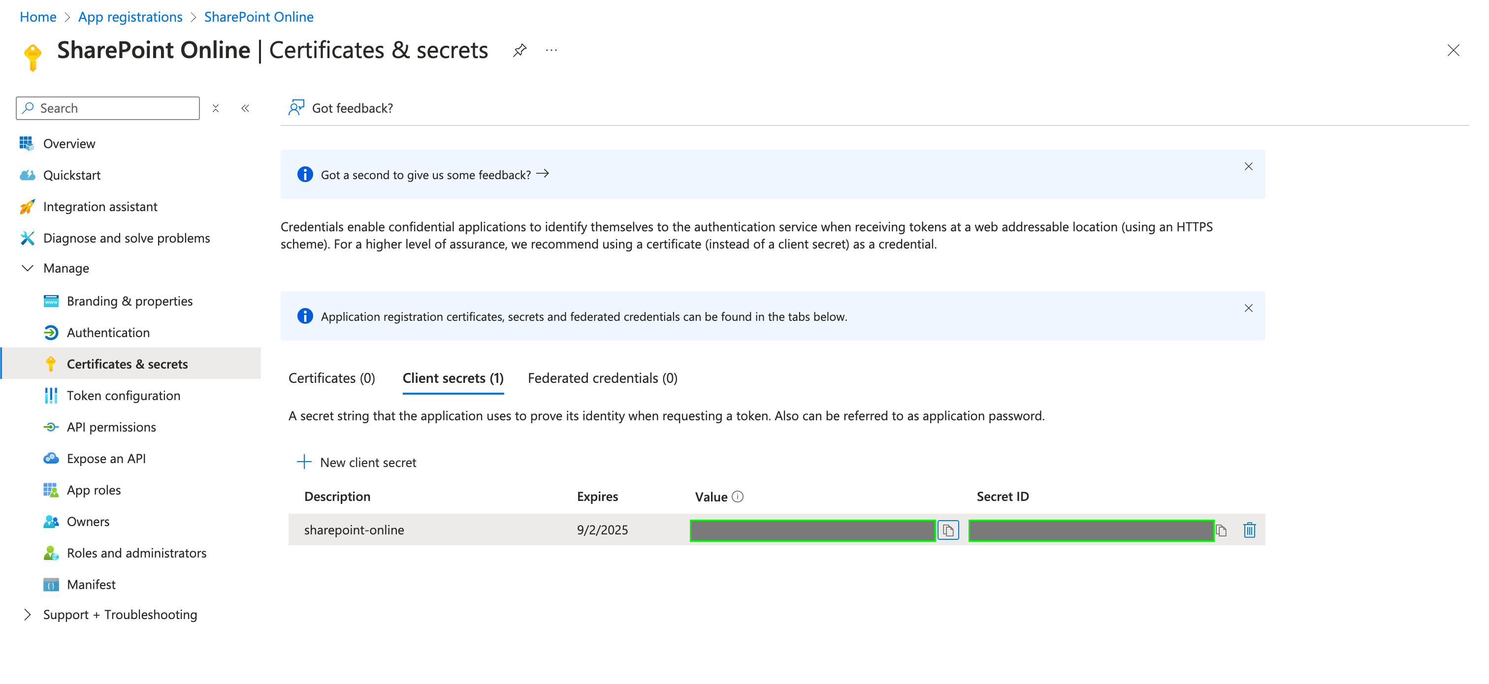 - After registering a new app in the step above, you can now generate a client secret for that specific application. Navigate to Certificates & secrets under Manage, and click New client secret.