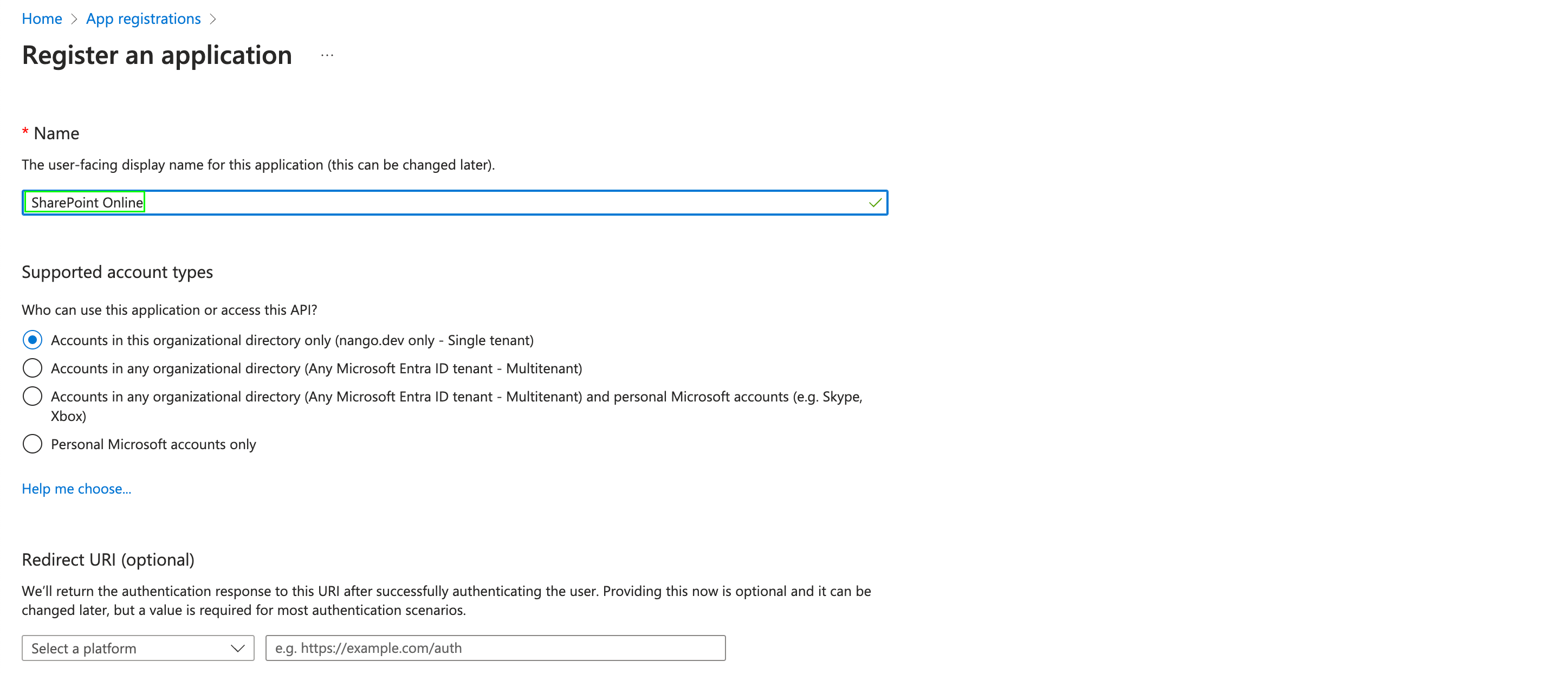 - In the Register an application section, enter a meaningful application name to display to users. Select who can use this application based on your environment and click Register.