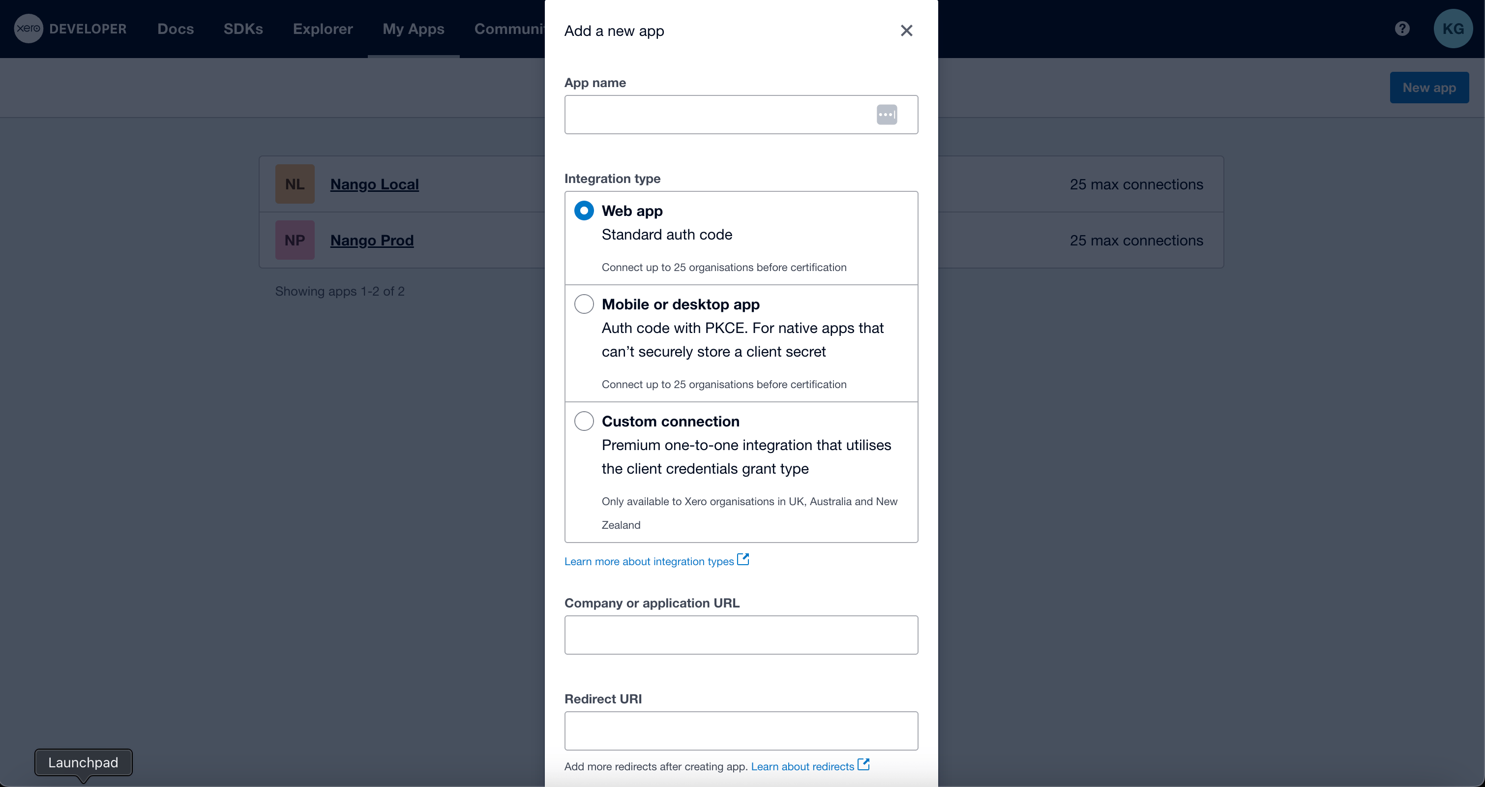 1. Select Web app as the integration type.